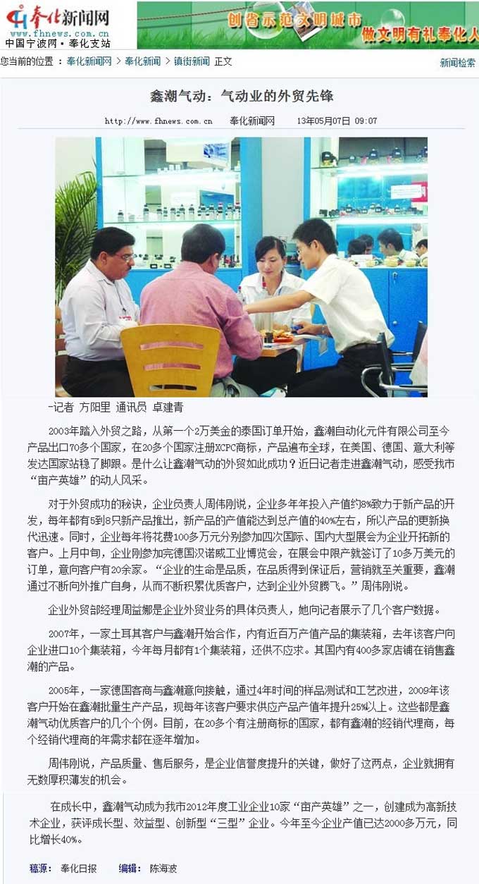 2013年5月,鑫潮氣動被奉化日報,奉化新聞網(wǎng)多家媒體采訪, 我公司目前已經(jīng)成了氣動業(yè)的外貿(mào)先鋒,詳細(xì)報道請參考以下鏈接: